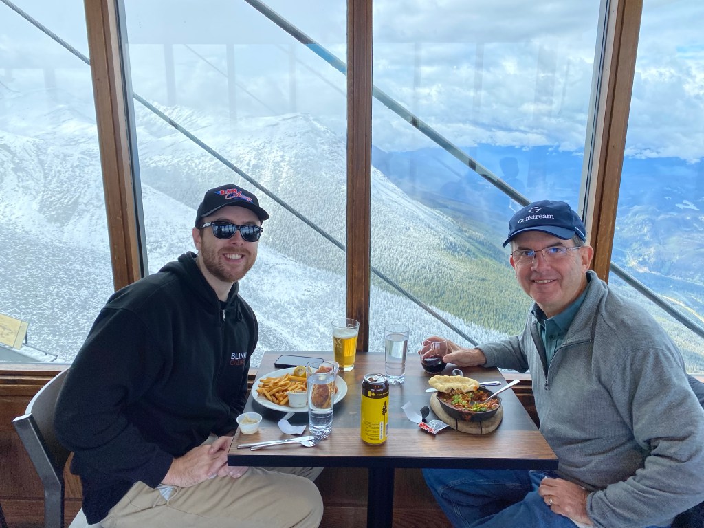 We had lunch at the peak restaurant: I had some warm bison chili with a glass of Canadian Merlot. Ian had fish and chips with a local Pilsner. And we split a slice of triple chocolate cake.