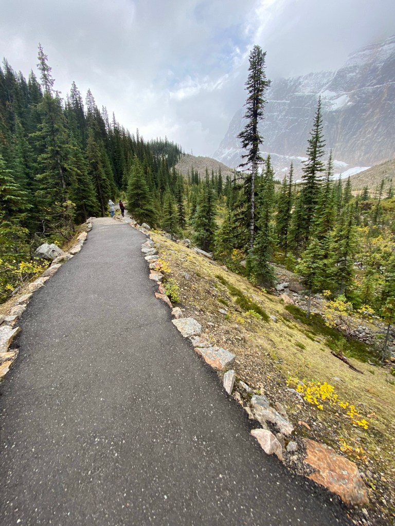 Once we snaked our way up a narrow road to Edith Cavell Mountain, we parked and headed up an innocuous looking asphalt trail into a breathtaking cathedral of towering rock cliffs. The path led to a glacier-fed lake that was precariously positioned just underneath not one, but two significant glaciers.