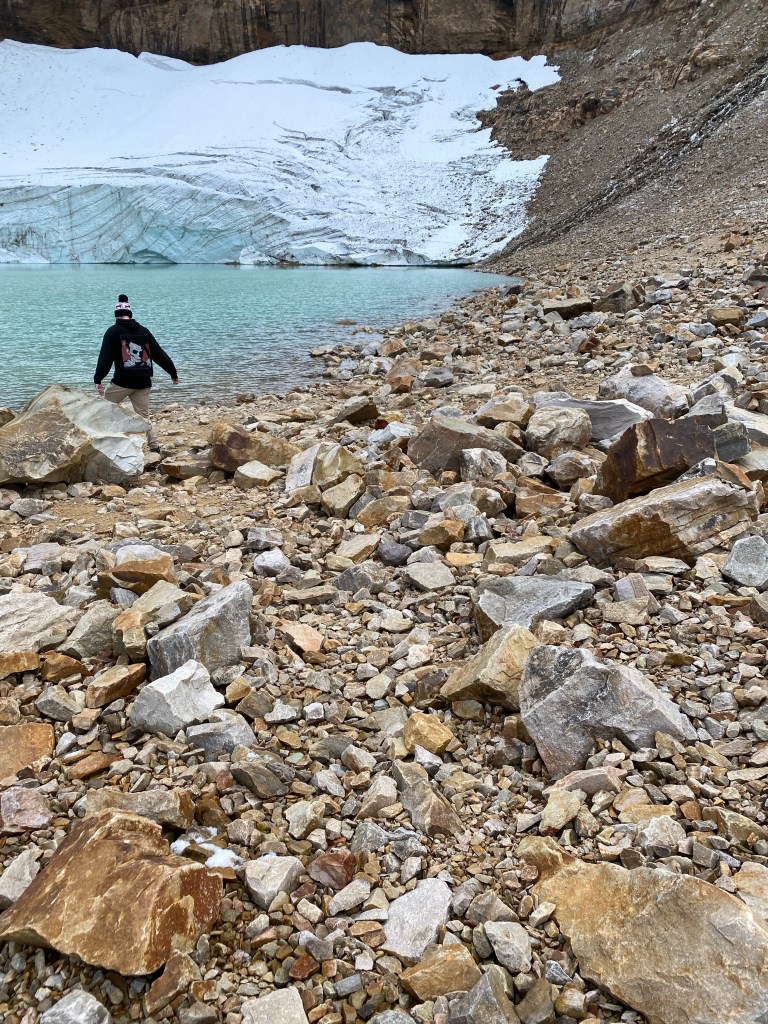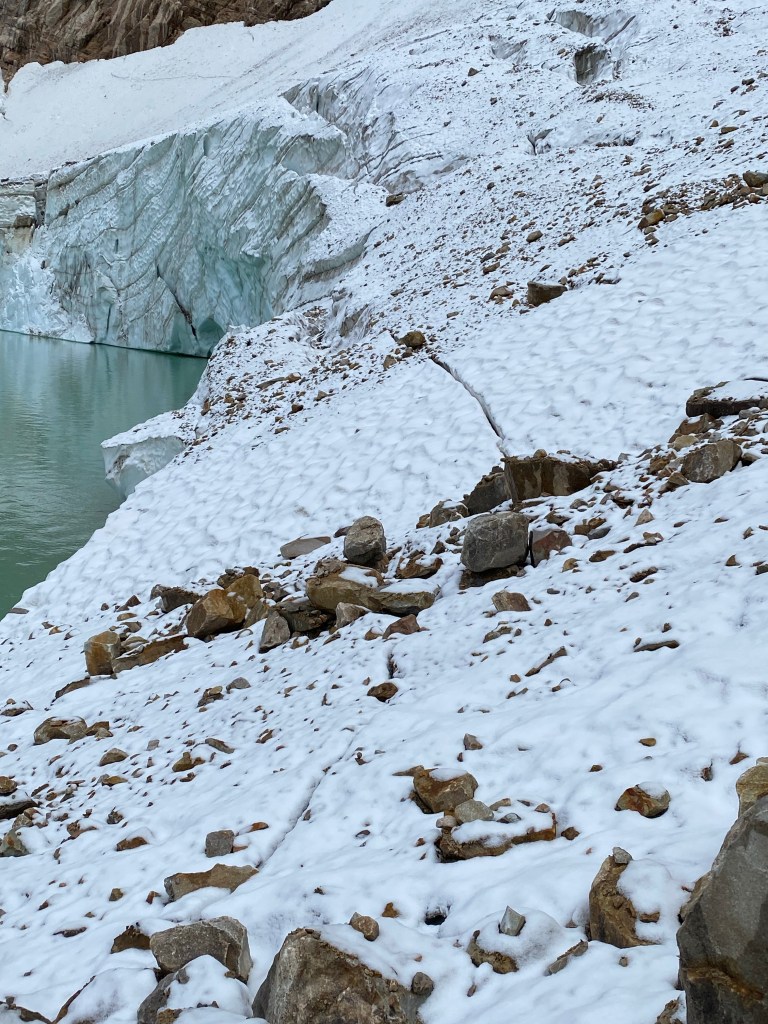 Here is where we made a series of decisions that would both save us and challenge us. The first decision was whether to go clockwise or counter-clockwise around the lake to get to the glacial ice. Both ways had field of boulders and limited or non-existent paths. We started out clockwise.